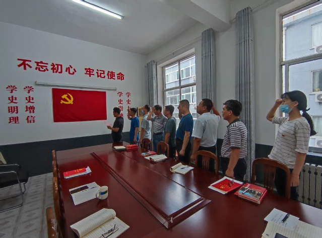 重温入党誓词——各支部全体党员面对党旗重温入党誓词。通过重温入党誓词,大家再一次体会到作为一名共产党员的责任感和使命感,表示一定要在党史学习中砥砺初心使命,在工作中践行入党誓词,以实际行动发挥党员的先锋模范作用。