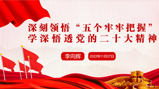李向辉以《深刻领悟“五个牢牢把握” 学深悟透党的二十大精神》为题,结合党的二十大精神的学习体会,对习近平总书记参加党的二十大广西代表团讨论时提出的学习贯彻党的二十大精神,要“牢牢把握过去5年工作和新时代10年伟大变革的重大意义,牢牢把握新时代中国特色社会主义思想的世界观和方法论,牢牢把握以中国式现代化推进中华民族伟大复兴的使命任务,牢牢把握以伟大自我革命引领伟大社会革命的重要要求,牢牢把握团结奋斗的时代要求”这“五个牢牢把握”,进行了深入的梳理、分析和阐释,强调“五个牢牢把握”是对党的二十大报告最精准的解读、最权威的辅导,是学习贯彻党的二十大精神的重要思想指引和行动指南,具有方法论的重要指导意义。要求全体党员要坚定历史自信、增强历史自觉、把握历史主动,深刻领会党的创新理论蕴含的道理学理哲理,明确中国共产党要干什么的根本问题,坚定做到“五个牢牢把握”,始终坚守初心使命,在党的旗帜下团结成“一块坚硬的钢铁”,心往一处想、劲往一处使,发扬斗争精神、增强斗争本领,以担当作为、积极作为的态度和行动推动总支及各单位高质量发展。